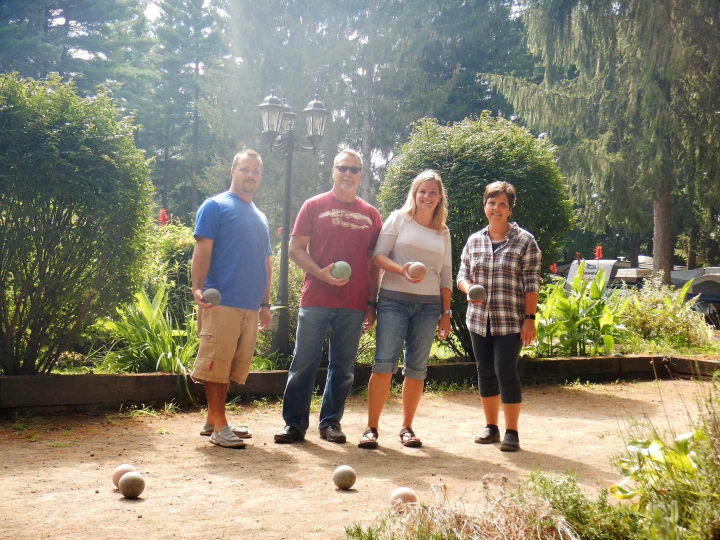 We started the day Saturday with another fire to cook breakfast on.  We made pie iron breakfast sandwiches, it was a bit of a challenge with 13 people.  The playground and basketball court provided entertainment for our children for a good part of the afternoon.  We also rode our bikes around the campground, played corn hole and bocce ball.